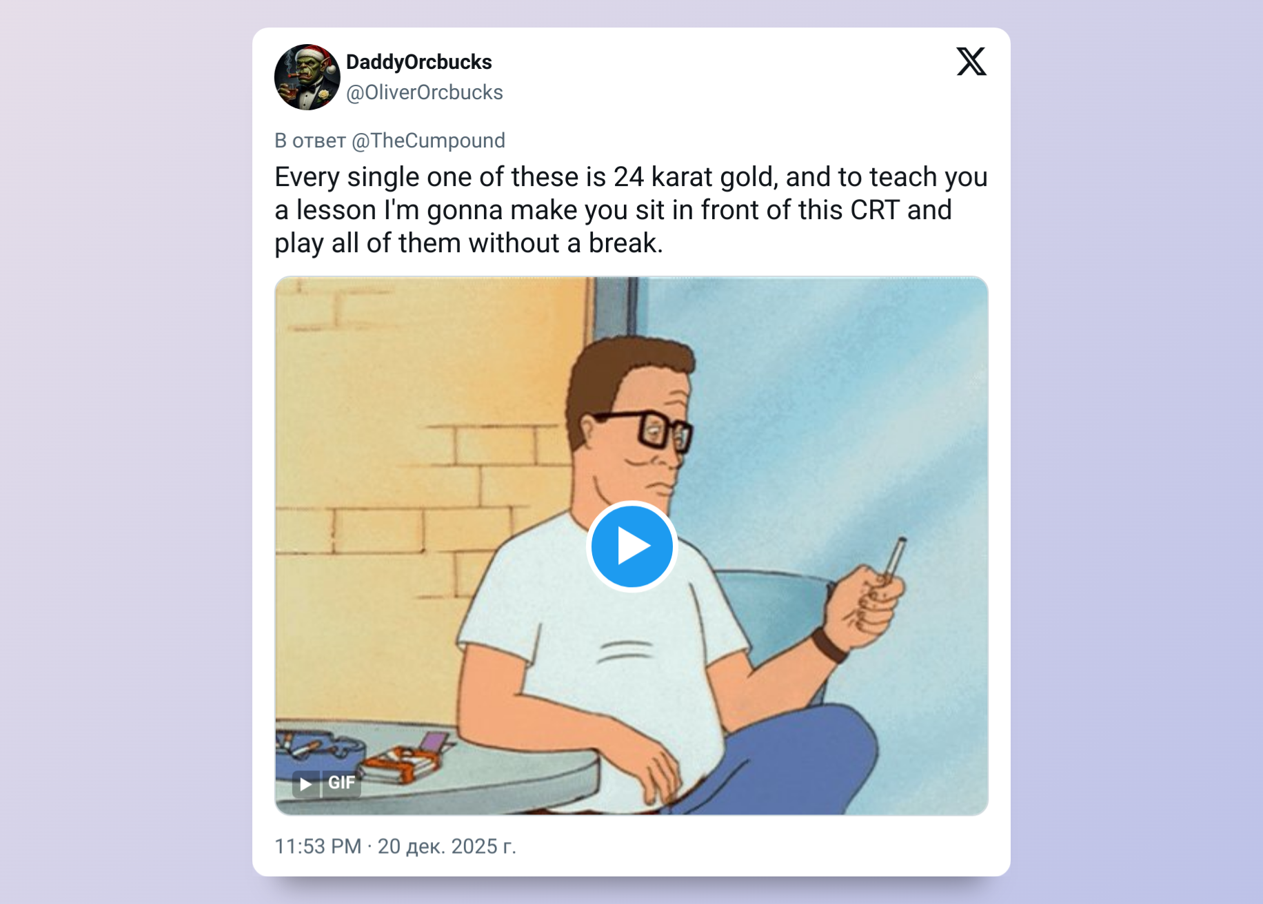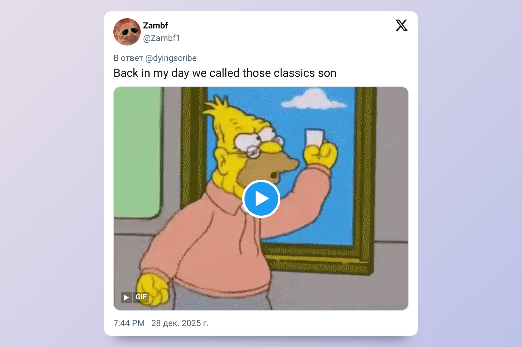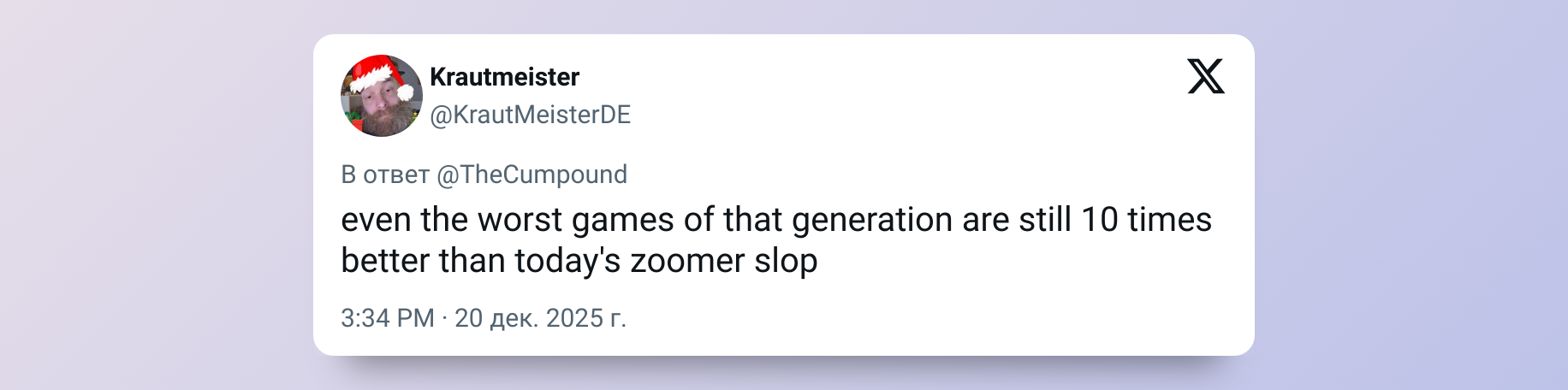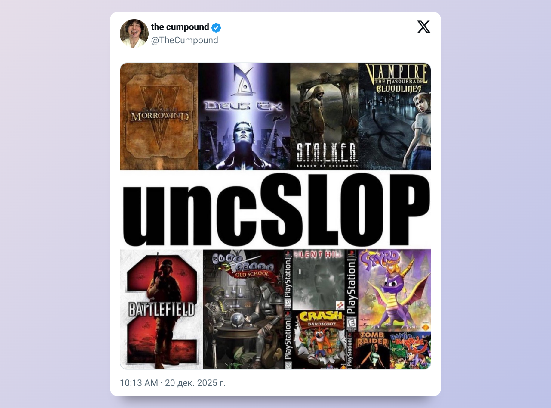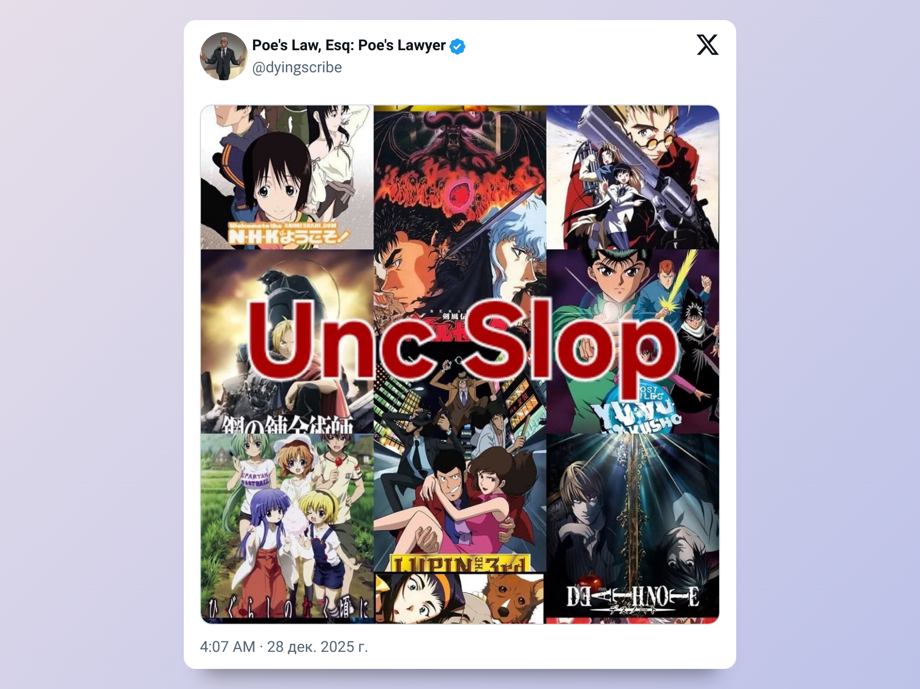 В конце декабре 2025-го на популярных онлайн-площадках начал набирать обороты новый сленговый термин Unc Slop (дословно можно перевести как «дядины помои»). Подростки и зумеры применяют его по отношению к видеоиграм и аниме 90‑х и начала 2000‑х — всему тому, что миллениалы считают культовым наследием.