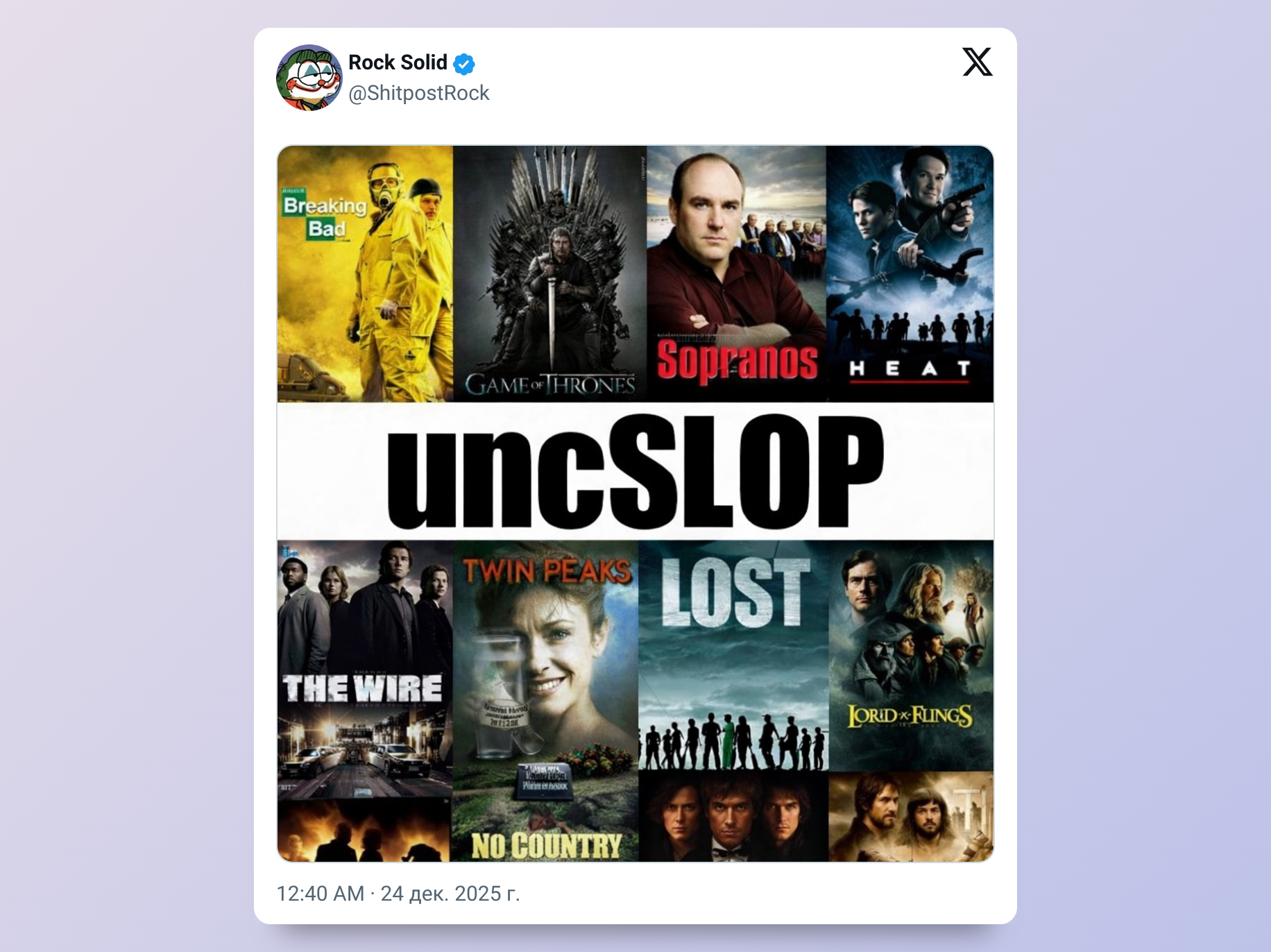 Обложки сериалов даже «обернули» в «ИИ-слоп» — так всё чаще называют бездушный цифровой контент низкого качества, который создаётся в больших объёмах с помощью искусственного интеллекта.