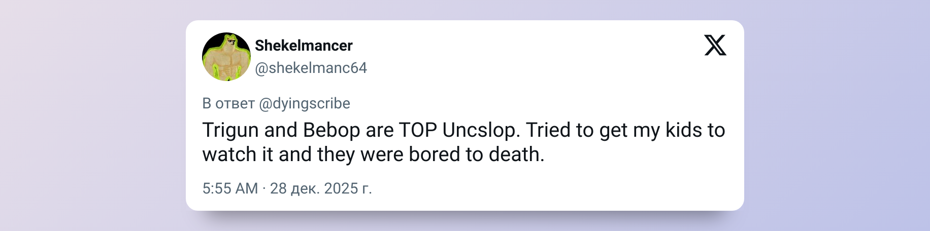 «Триган» и «Бибоп» — топ Uncslop. Пытался заставить детей посмотреть их, но им было ужасно скучно.