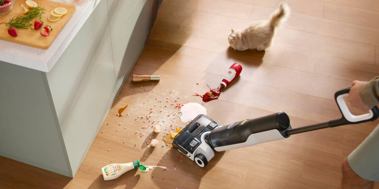 Модель берёт на себя всю рутину: собирает мусор и моет полы, причём делает это без разводов благодаря роликовому скребку, который постоянно прижимается к покрытию. Пылесос справляется со свежими и старыми загрязнениями, мелким и крупным мусор вроде яичной скорлупы и не оставляет после себя лужи, потому что полностью засасывает грязную воду в отдельный бак. Одного заряда хватает на 60 минут использования или на семь полноценных уборок квартиры площадью 55 м².