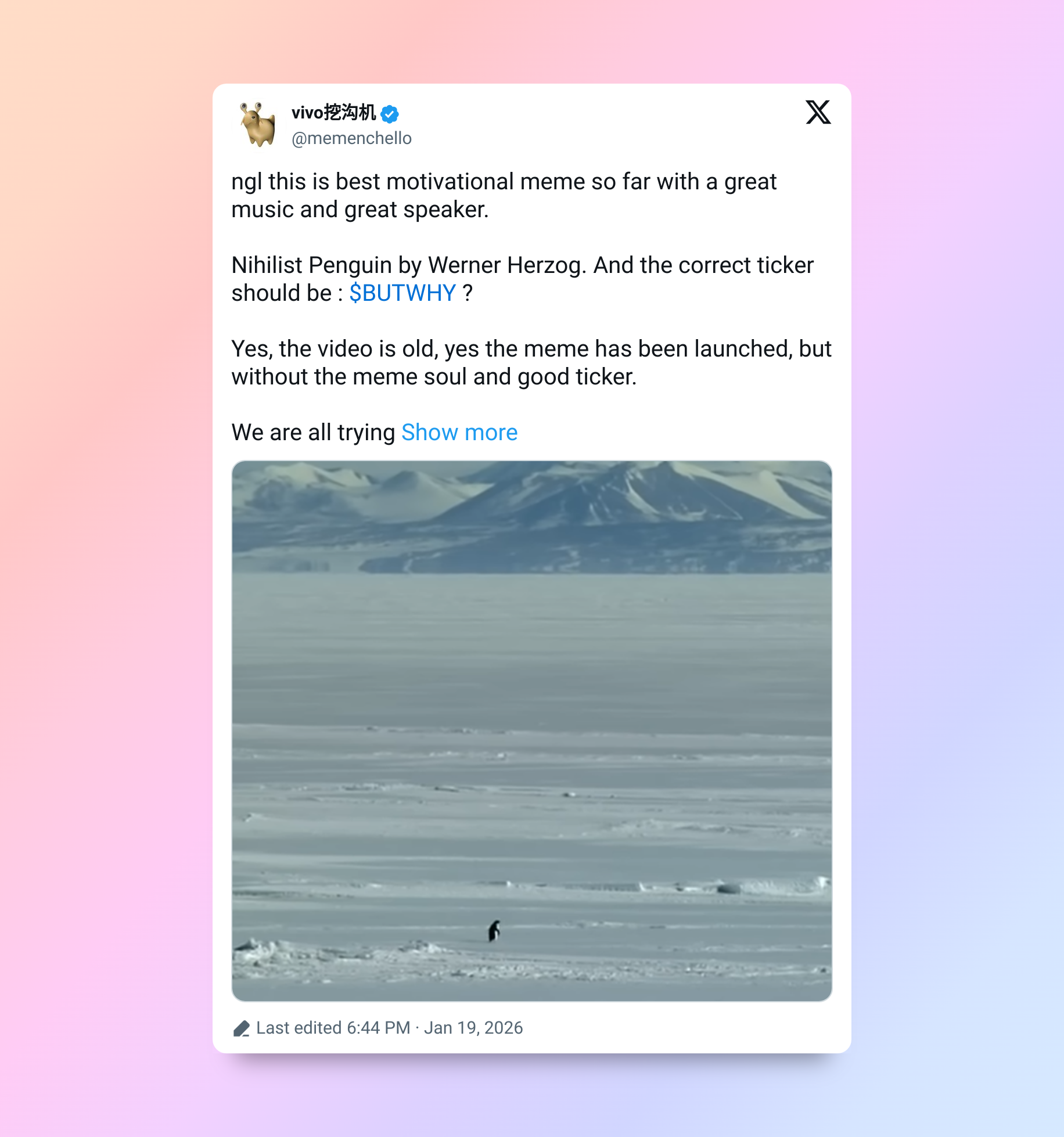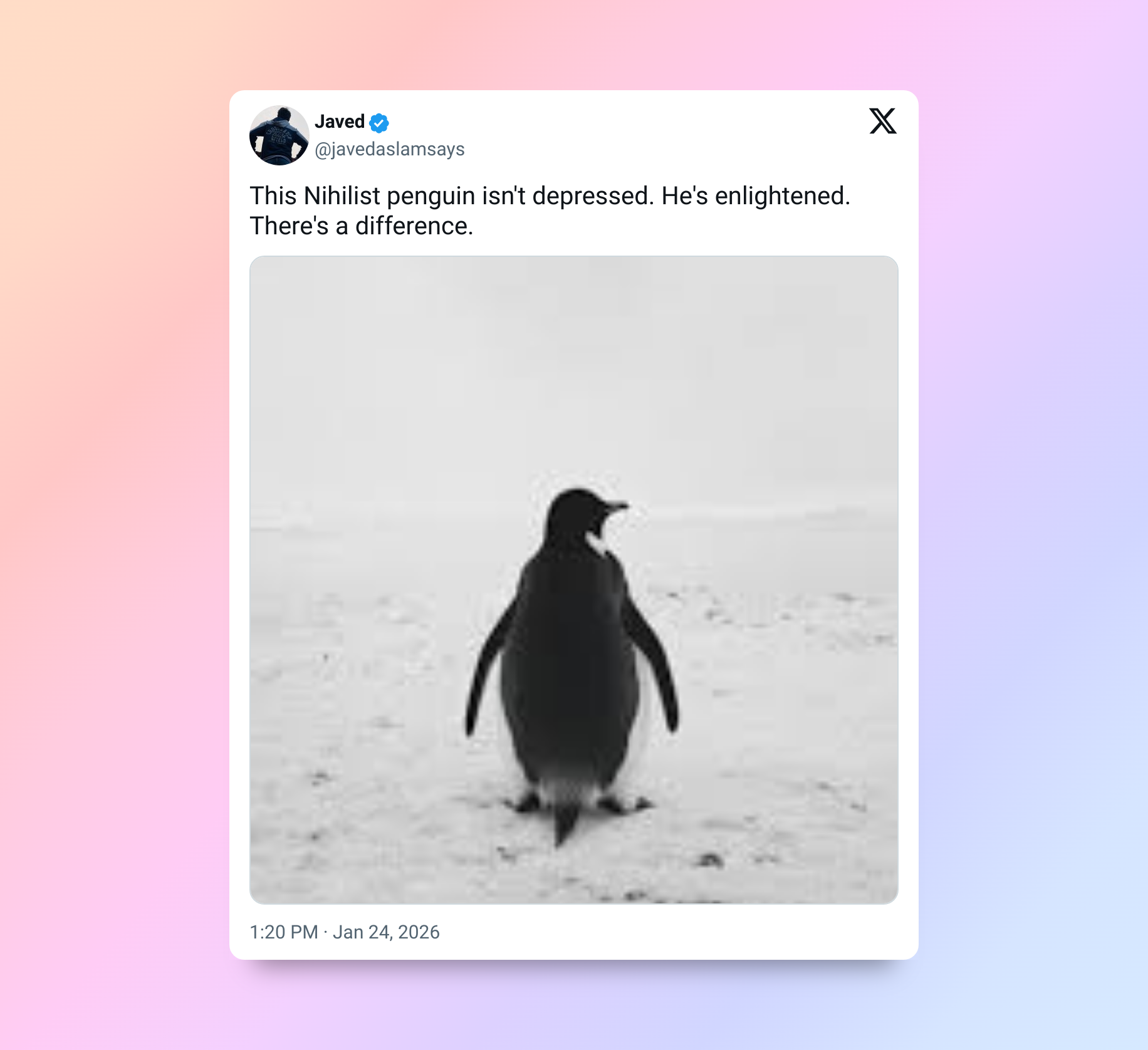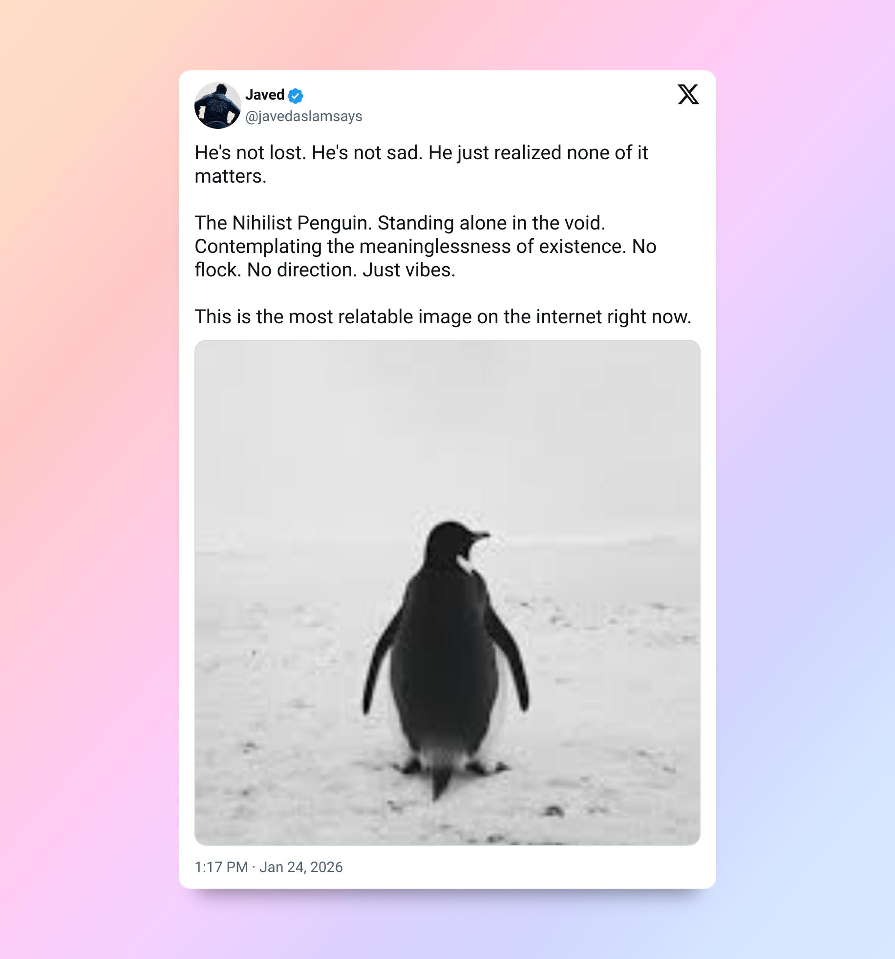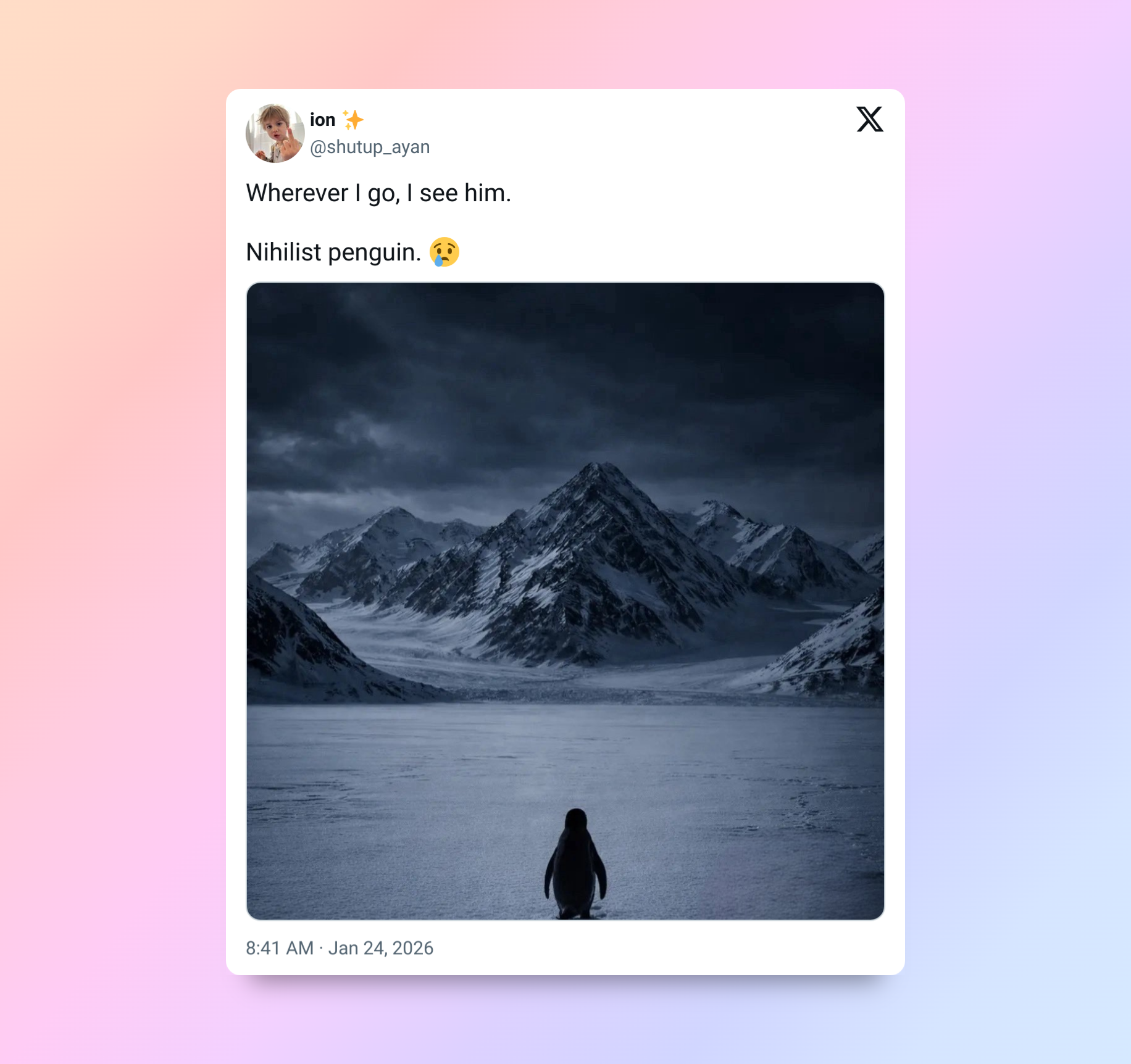 «Куда бы я ни пошла, я вижу его. Пингвин-нигилист 😢».
