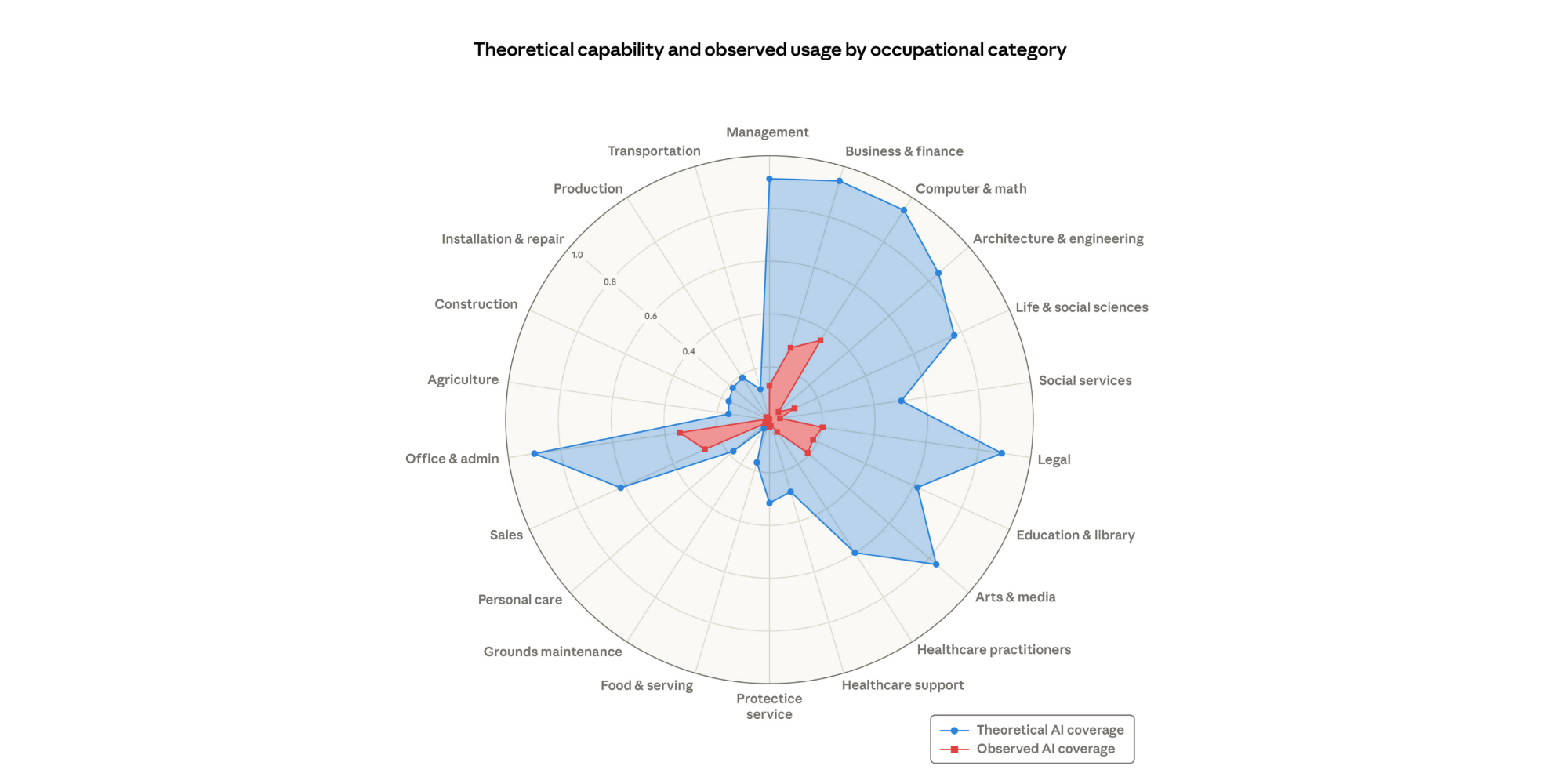 - ИИ пока далёк от реализации своих теоретических возможностей. Например, Claude охватывает лишь 33% задач в категории «Компьютерные науки и математика».