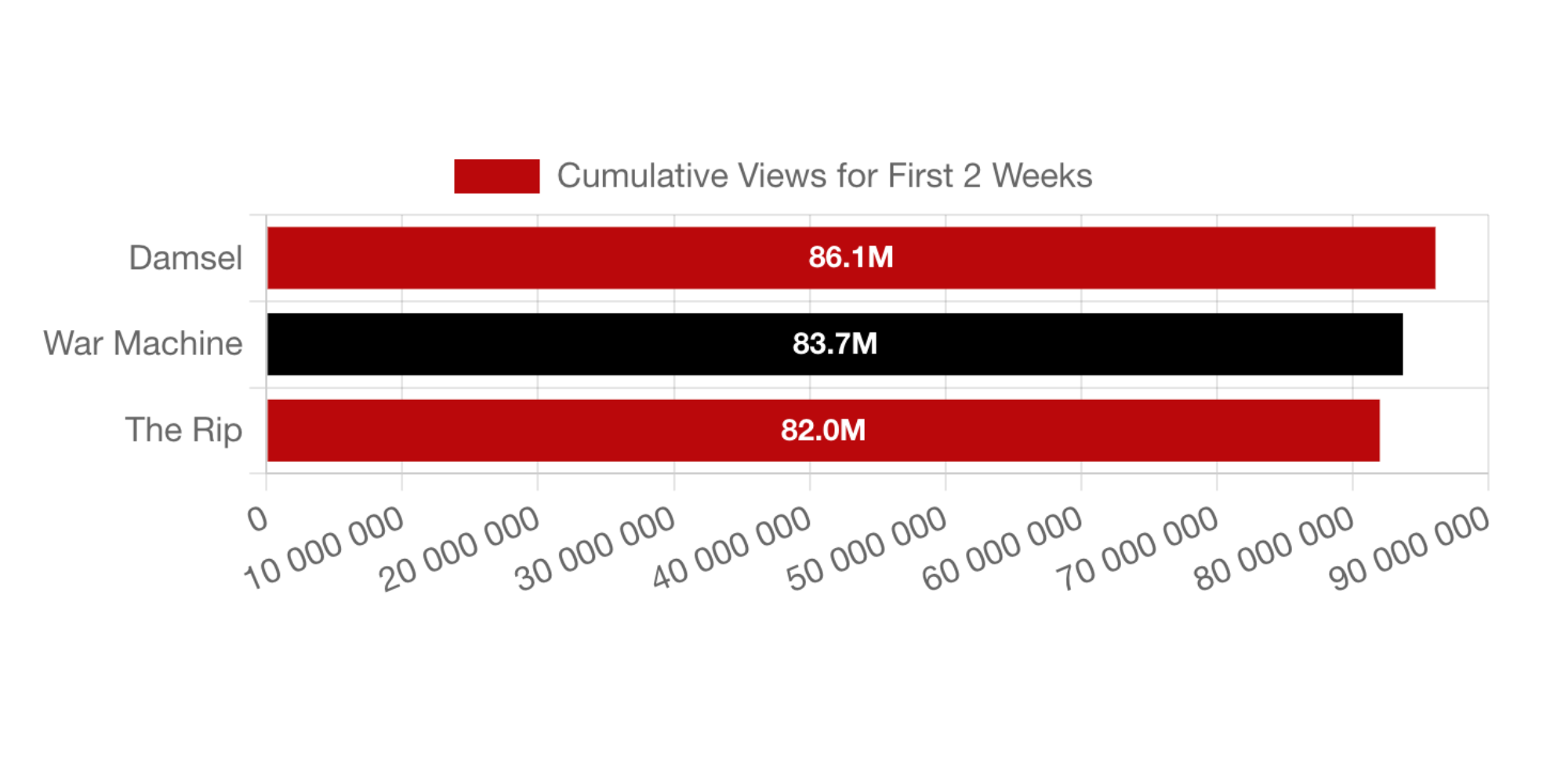 Говорить о попадании в десятку самых успешных фильмов платформы пока рано — всё решат цифры в ближайшие недели. Однако темп у «Военной машины» сопоставим с фэнтези «Дева и дракон» с Милли Бобби Браун, которое сейчас замыкает исторический топ‑10 и за первые две недели собрало 86,1 миллиона просмотров (итоговый результат — 123,3 миллиона).