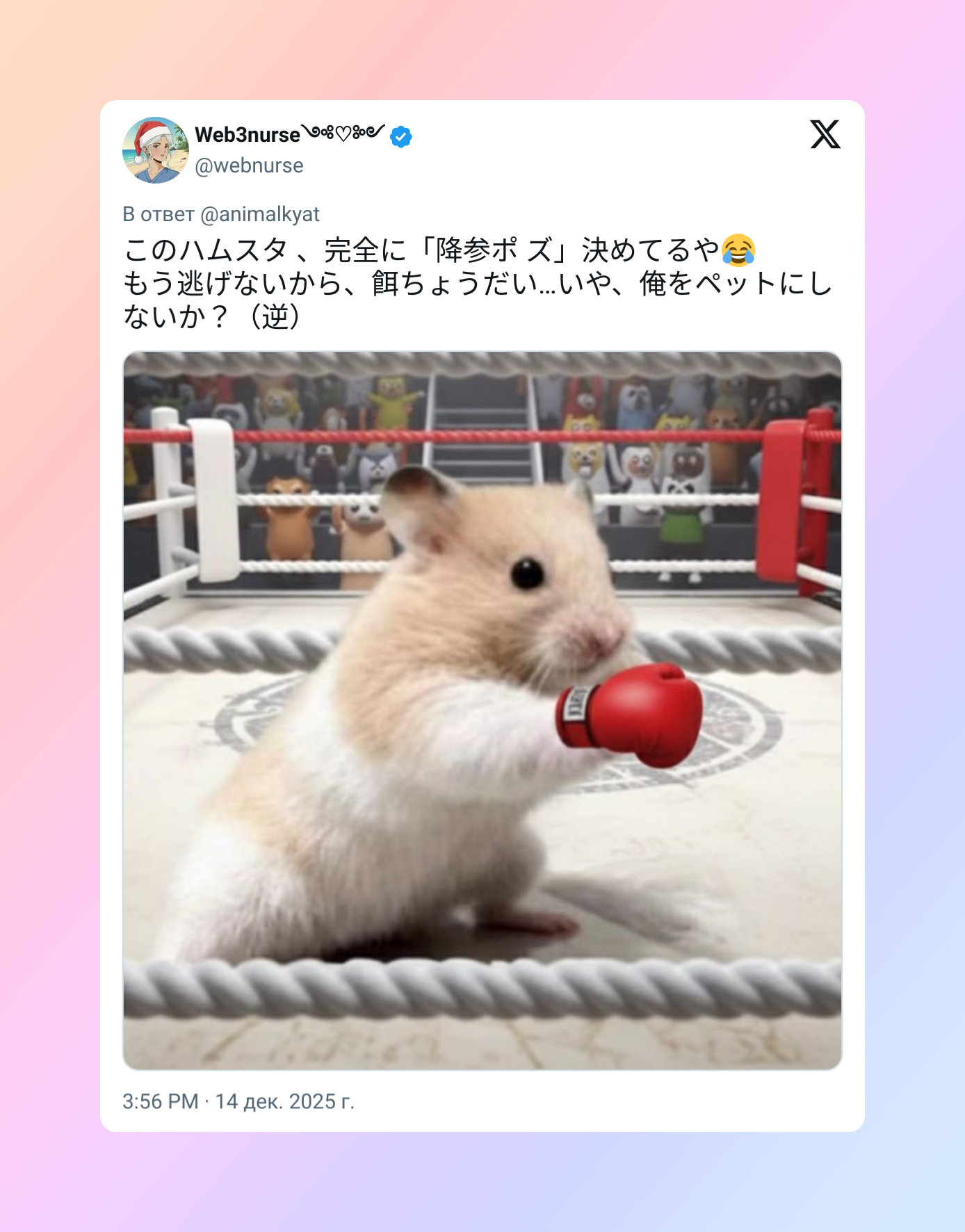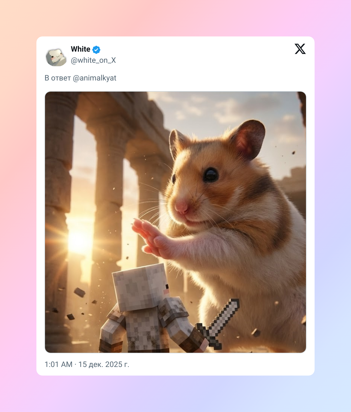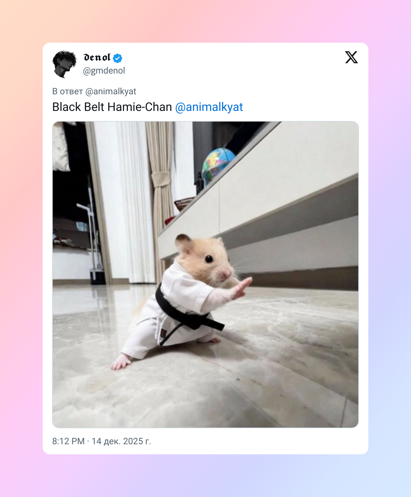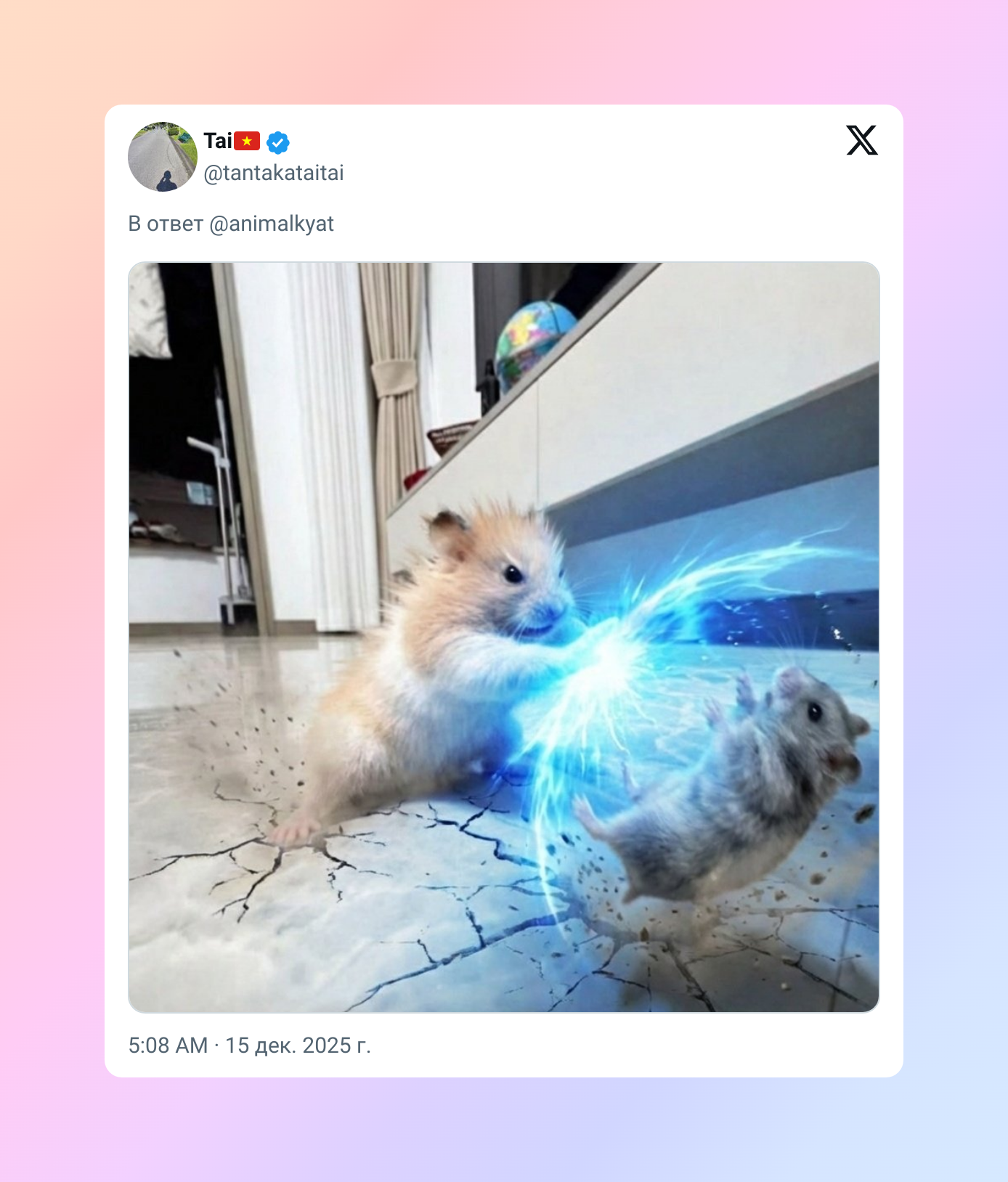 В соцсети X набирает популярность с фотографией хомяка в необычной позе — тот будто готовится к бою. Пользователи быстро превратили снимок в мем — кто-то с помощью нейросетей нацепил на зверька солнцезащитные очки, а кто-то наделил его волшебными силами и отправил сражаться с другими хомяками.