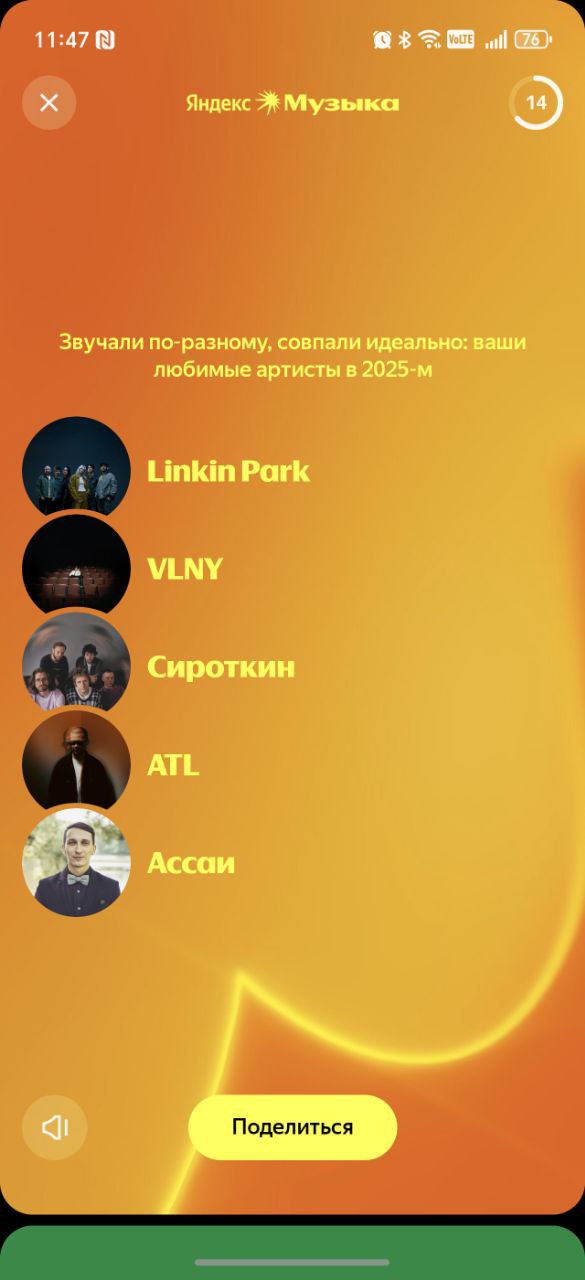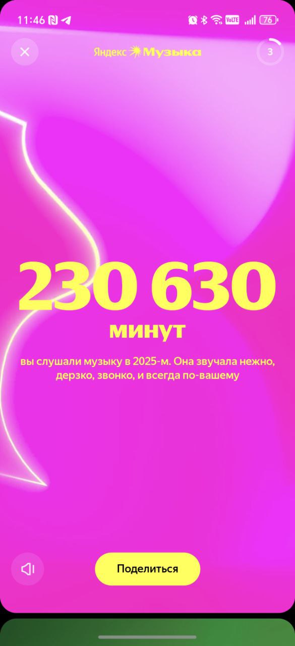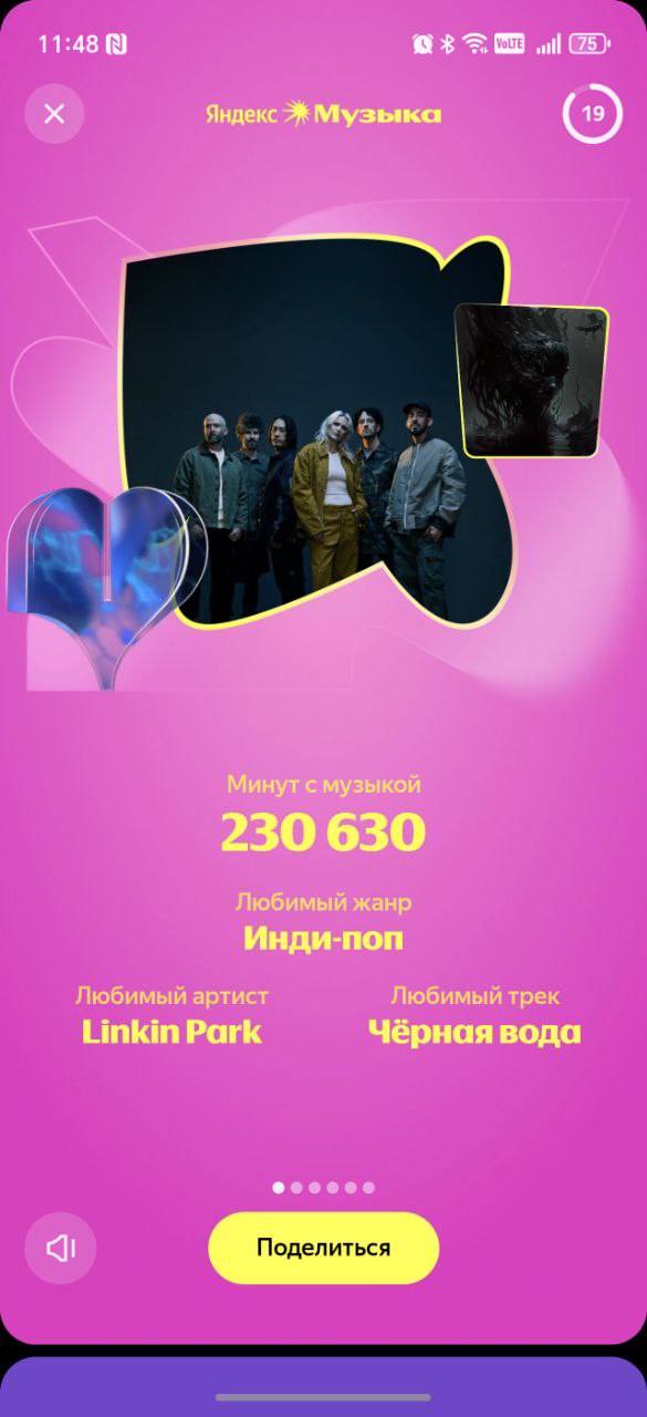 Сервис показывает общее число прослушанных минут, количество добавленных в избранное новинок, три основных жанра, топ из пяти любимых треков и число артистов, которые появлялись в «Моей волне». Есть вероятность увидеть видеовизитку от исполнителя, вошедшего в ваш топ‑5.