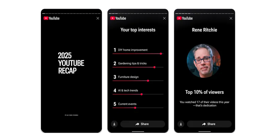 YouTube Recap — персональные итоги года, в которых собраны самые интересные привычки пользователя в плане просмотра видео. В подборку входят ключевые интересы, более глубокие увлечения и информация о том, как менялись ваши вкусы.