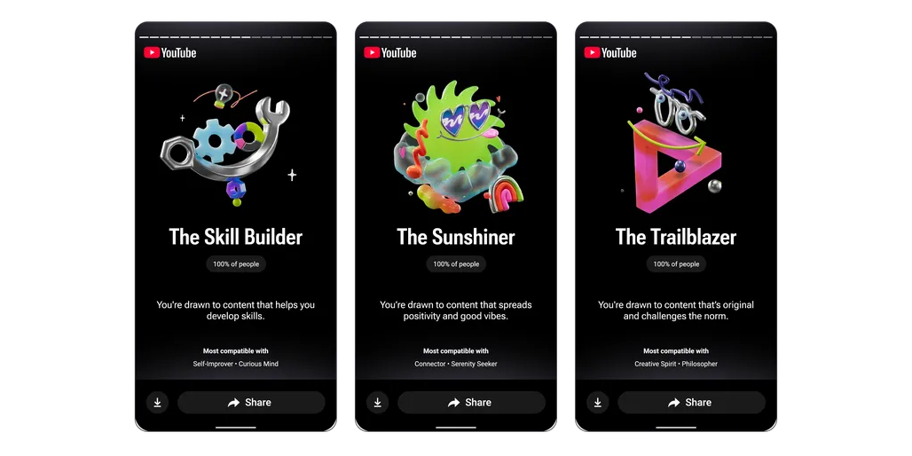 Пользователю присваивается «тип личности» на основе того, что он смотрел в течение года — например, «Искатель приключений». Также есть музыкальная статистика, которая работает отдельно от итогов года в YouTube Music.
