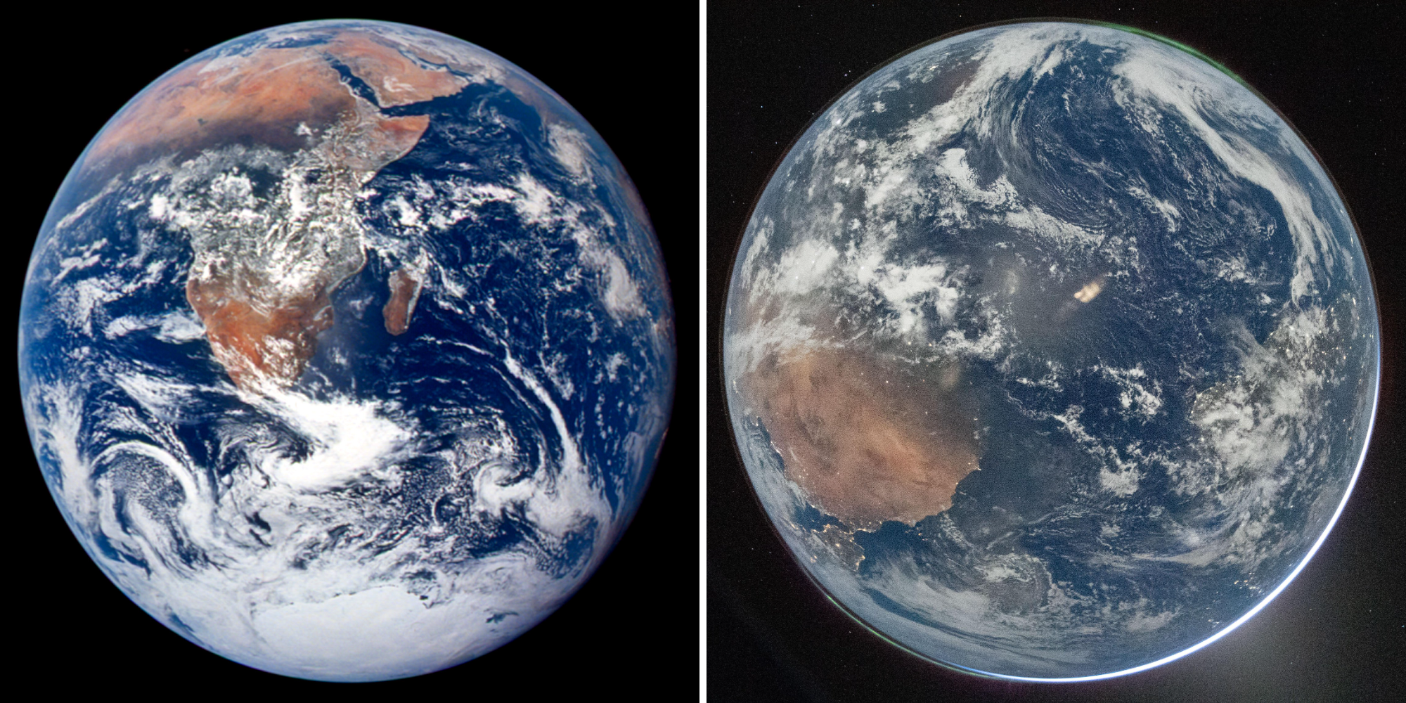 На снимке атмосферу красиво подсвечивает зелёное северное сияние. Впервые с миссии «Аполлон‑17» в 1972 году удалось получить цельное фото Земли. Все последующие изображения собирались из множества кадров, сделанных с низкой орбиты.